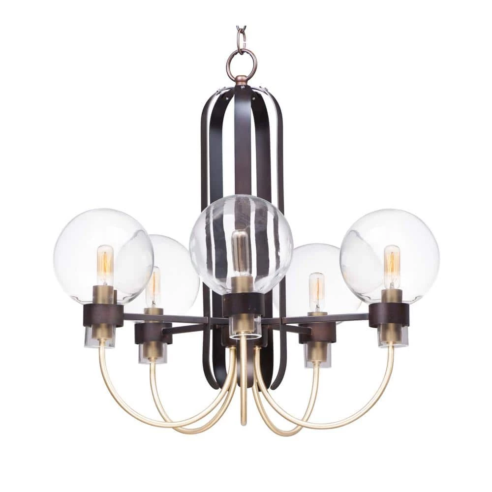 The Bauhaus 24 in. W 5-Light Bronze/Satin Brass Chandelier with Clear Shade is a great addition to any indoor space. This high quality light can be used in a variety of applications. Provide both function and style to your indoor area with this wonderful fixture.