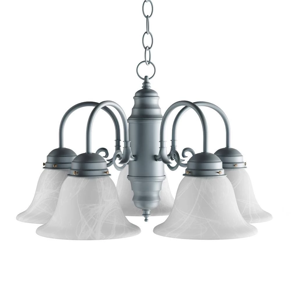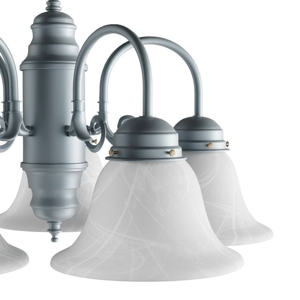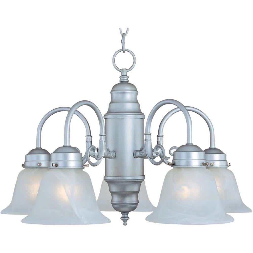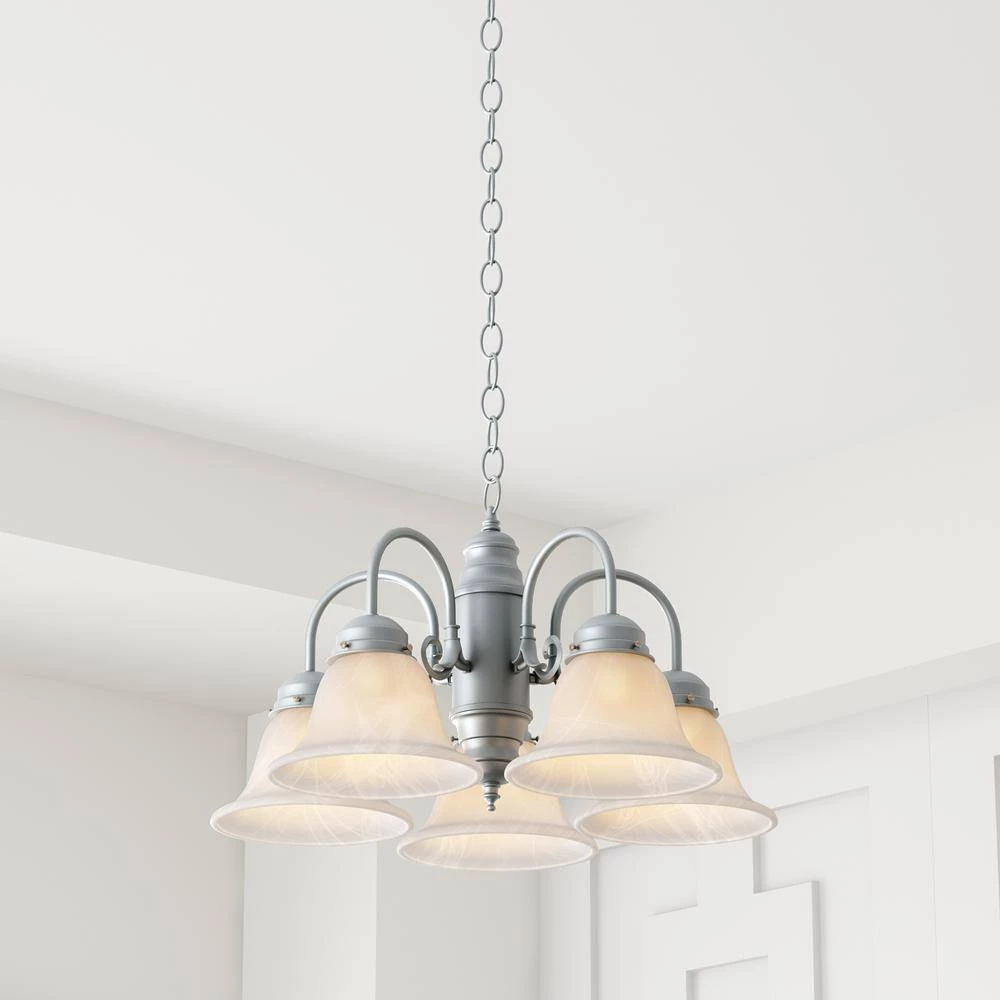 Brighten your home in style with this 5-light chandelier from the Builder Basics collection. Marble glass shades and a satin nickel finish make it the perfect fixture for modern and classic interiors. The distinctive look of this light creates a striking focal point in a kitchen, dining room or living room. It uses five medium base, incandescent 100-W bulbs (sold separately), has an adjustable hanging length and includes all the hardware for installation.