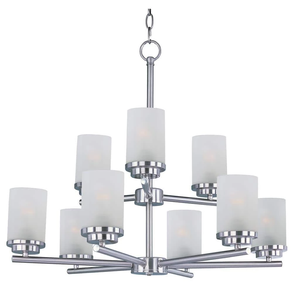 Minimalistic frames finished in your choice of Oil Rubbed Bronze or Polished Chrome support cylinders of Frost glass shades. A clean contemporary look at a very affordable price. This chandelier will add a great look to any room.