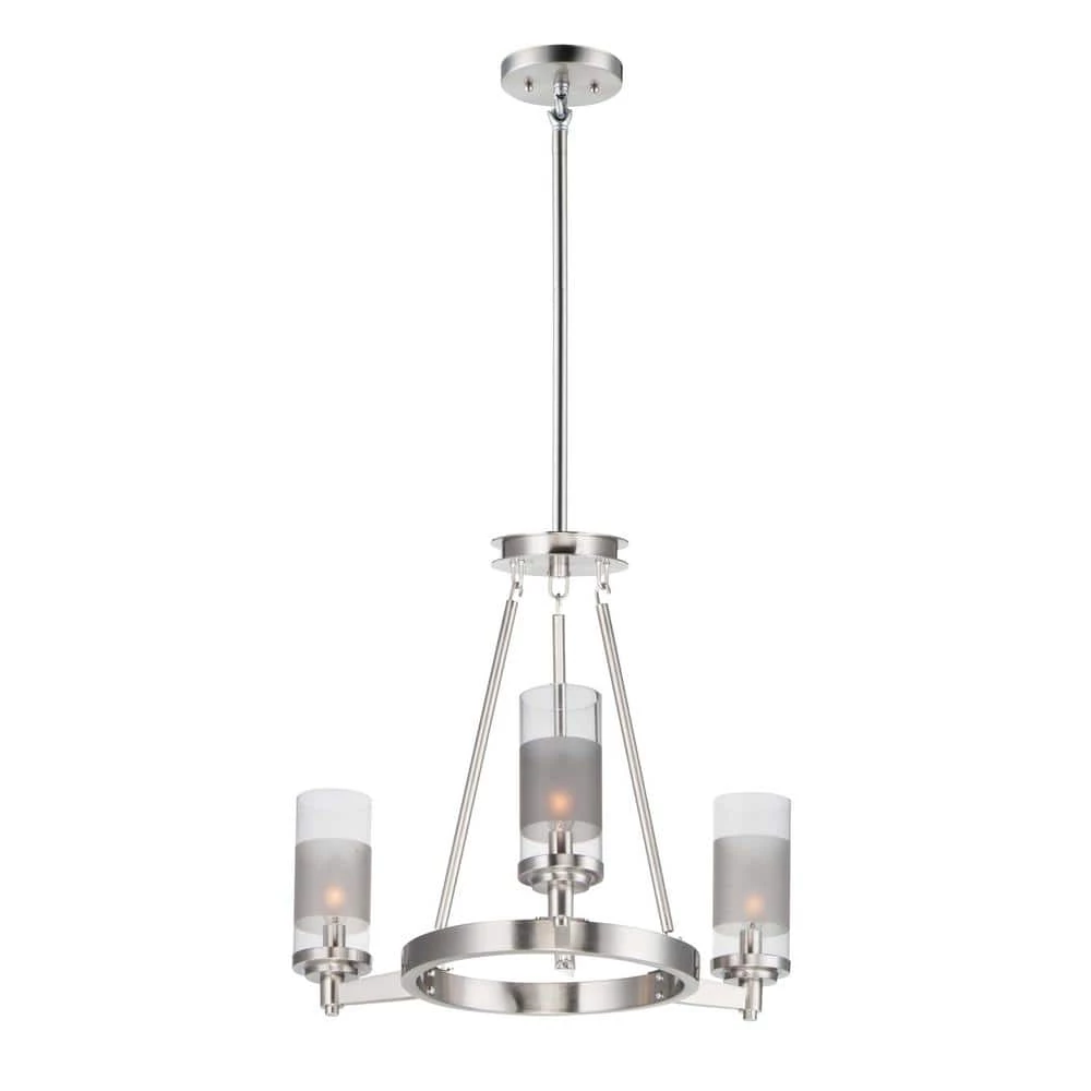 The Crescendo 20 in. W 3-Light Satin Nickel Chandelier with Clear/Frosted Shade is a great addition to any indoor space. This high quality light can be used in a variety of applications. Provide both function and style to your indoor area with this wonderful fixture.