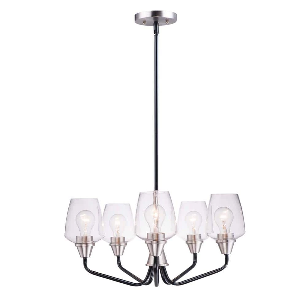 The Goblet 23 in. W 5-Light Black/Satin Nickel Chandelier with Clear Shade is a great addition to any indoor space. This high quality light can be used in a variety of applications. Provide both function and style to your indoor area with this wonderful fixture.