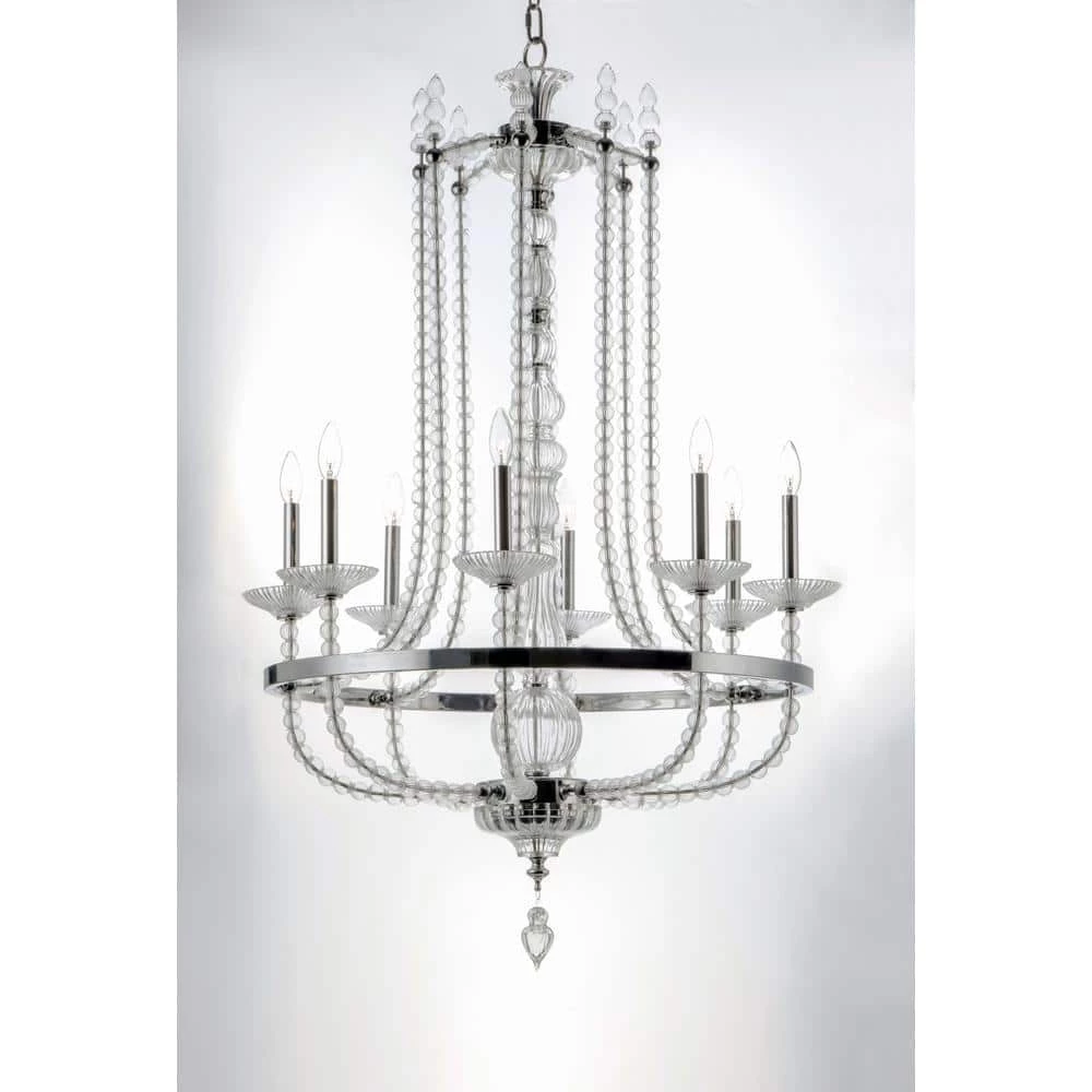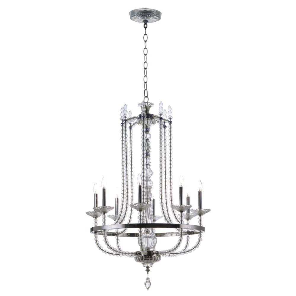 - Classic chandelier features frames of polished nickel adorned with hundreds of hand blown clear glass balls and fonts; ribbed design in glass adds texture and shimmer to this classic and delicate design