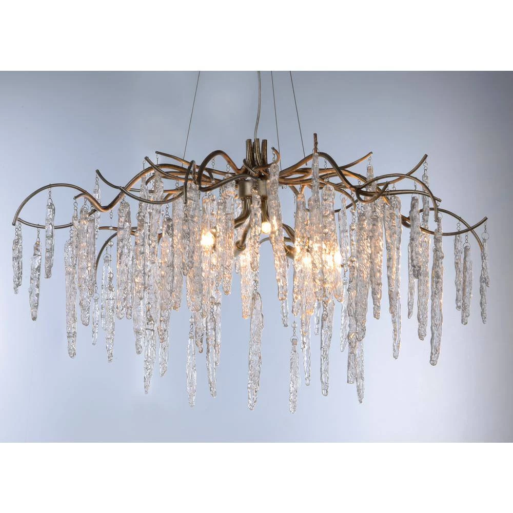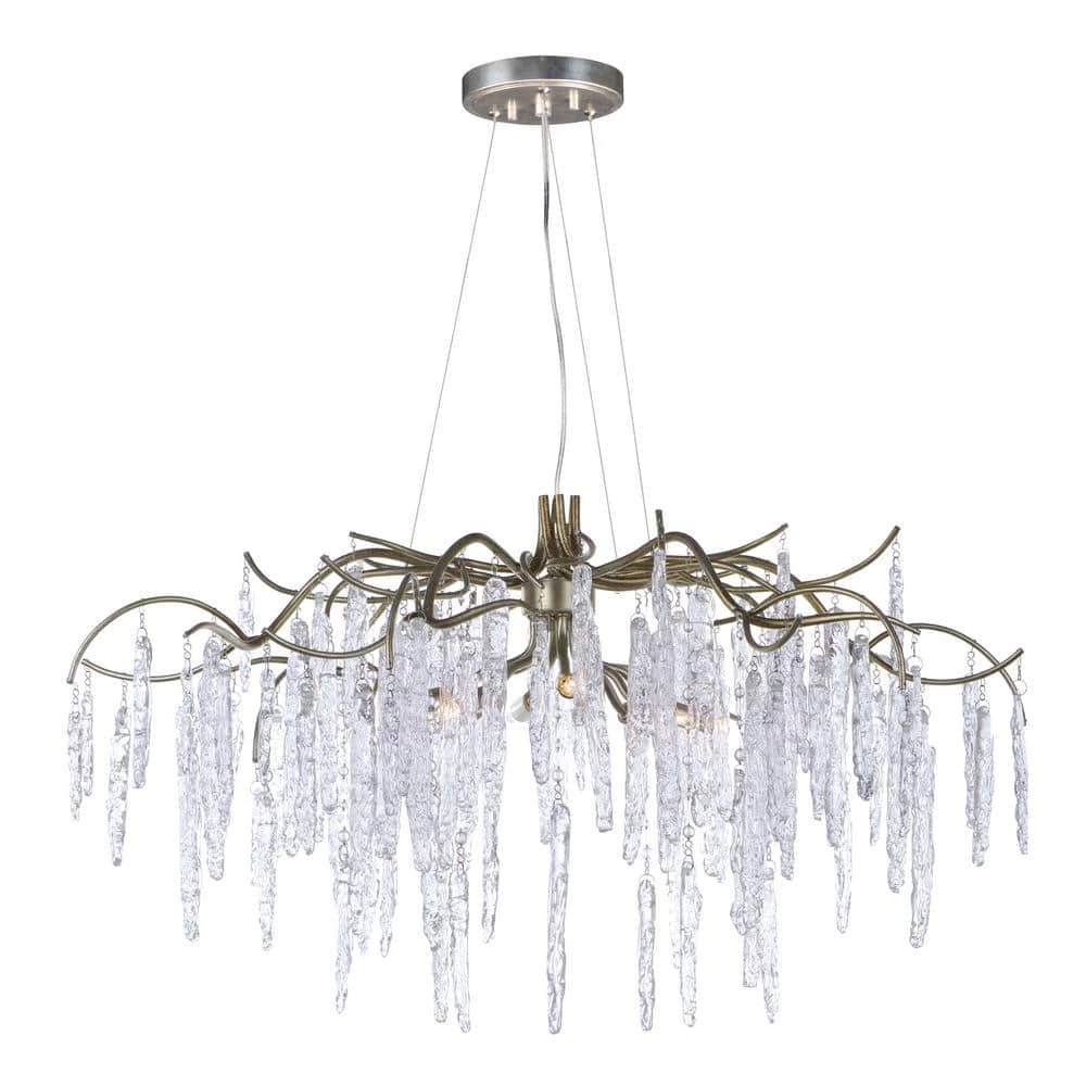 - Metal is formed in a branch-like design and finished in a rich silver gold, handmade pendants of piastra like ice glass are draped from the frame to complete this designer look